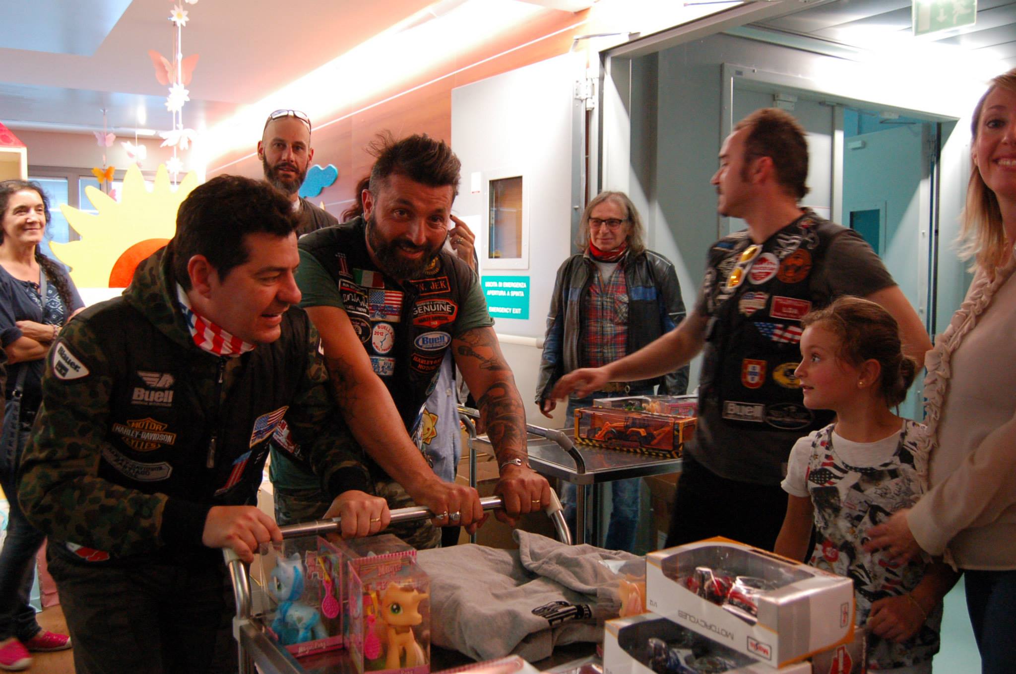 Si è svolta oggi la simpatica iniziativa Toy Run 2015. Toy Run è l’appuntamento che Quelli del Traliccio organizzano per portare un sorriso ai bambini in Ospedale, regalando bellissimi giocattoli direttamente ai bambini in reparto. I centauri hanno parcheggiato le loro amate moto nel cortile sud dell’ospedale, e hanno portato regali e giocattoli per i bambini. Li abbiamo accompagnati nei reparti di pediatria dove hanno incontrato i bambini e i ragazzi ricoverati. Grande sorpresa per i nostri ospiti ricoverati: i regali ricevuti e la simpatia dei motociclisti hanno strappato molti sorrisi!